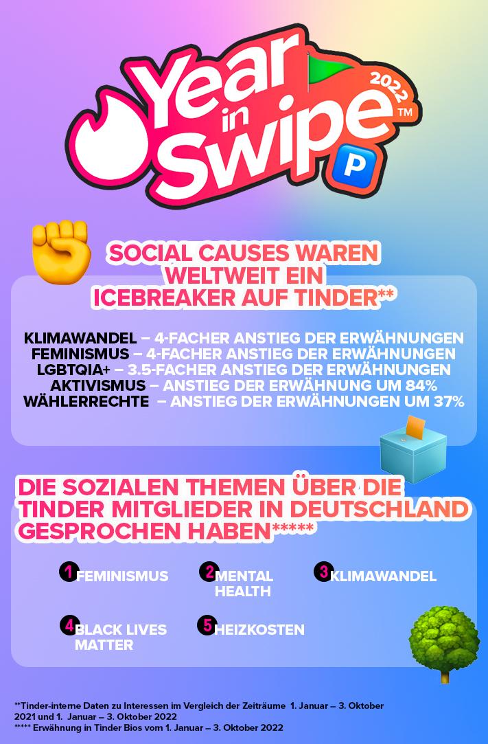 Die Einstellung zu soziopolitischen Themen wird vielen Tinder-Mitgliedern immer wichtiger – nicht nur im privaten Bereich, sondern auch bei der Partnersuche. Die Flagge der Ukraine wehte dieses Jahr in so vielen Profilen, dass sie es unter die Top 10 der beliebtesten Emojis auf Tinder geschafft hat und „Aktivismus“ hat es um 84 Prozent häufiger in die Interessen der Nutzer*innen geschafft.