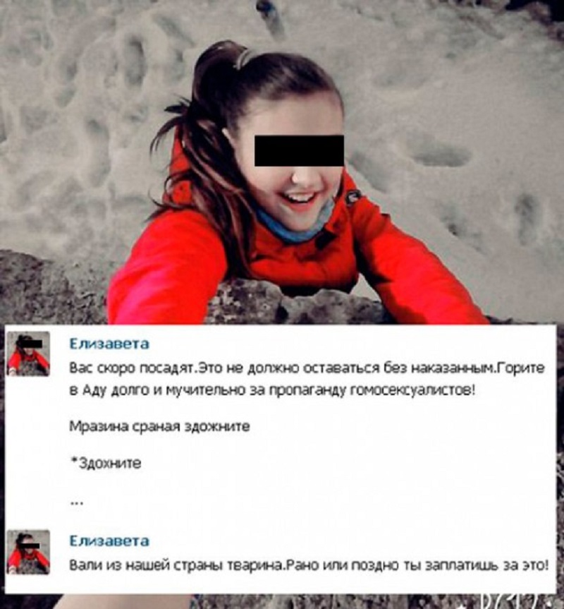 - „Sie werden jetzt jeden Tag nachsehen. Was du hier tust, kann nicht ungestraft bleiben. Ich hoffe, dass du eine lange Zeit in der Hölle schmorst, für diese homosexuelle Propaganda. Strib, du scheiß Abschaum. Verlass unser Land, du Stück Scheiße. Früher oder später wirst du dafür bezahlen.“
