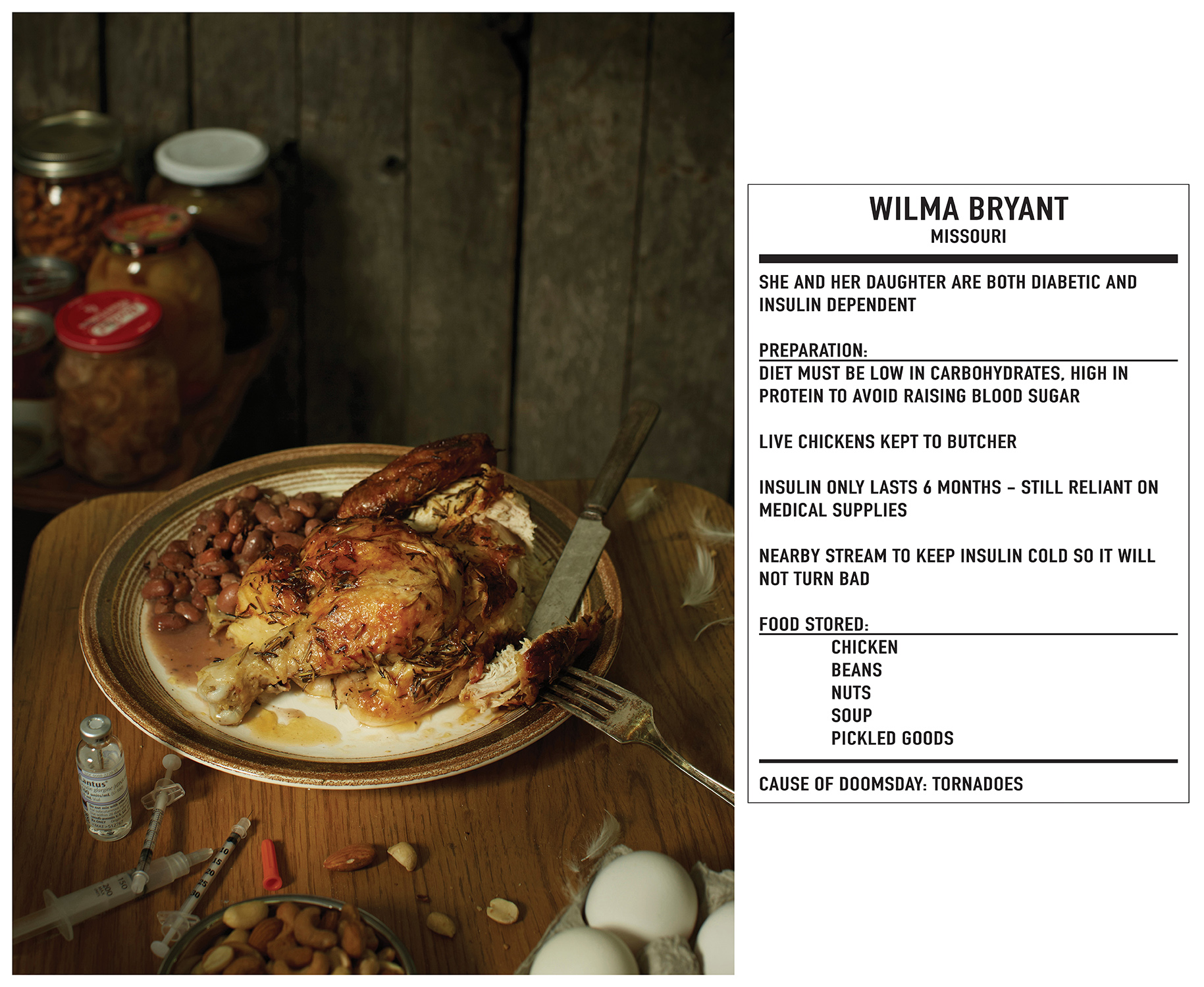 Wilma Bryant lebt zusammen mit ihrer Tochter in Missouri, beide sind Diabetikerinnen. Sie halten eine spezielle Diät, um den Blutzucker niedrig zu halten, haben Insulin-Vorräte für ein halbes Jahr und züchten Hühner, um sie zu schlachten. Sie haben Angst vor Tornados.